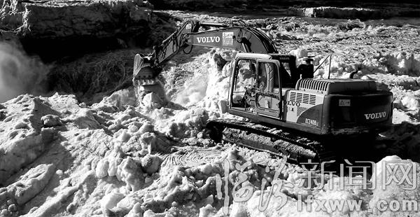临汾新闻网讯 为了确保游客安全,2月16日,吉县壶口瀑布景区组织工作人员出动两台挖掘机铲除瀑布岸边两三米厚的堆冰、安装防护栏和悬挂警示牌,并增加安全巡查人员,引导游客安全有序游览。 吕桂明 摄