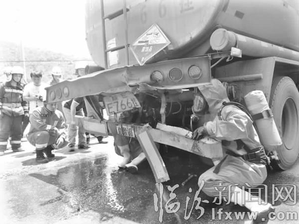 临汾新闻网讯 6月8日11点20分,在吉县屯里镇回宫村路段,两辆车发生追尾事故,一辆载有32吨液碱的罐车发生泄漏。事发后,吉县消防、交警、安检、环保等部门前往协同处置。据了解,一辆半挂车车头与挂载有32余吨液碱的罐车尾部相撞,导致罐车管道破裂,发生液碱泄漏。消防官兵在事故地段设置警戒线,疏散围观群众,以免造成伤害,经过一个多小时的紧张处置,罐车的泄漏部位被成功封堵。随后,消防官兵又对路面残留的液碱进行填埋。此次事故未造成人员伤亡。图为消防官兵对泄漏部位进行封堵。
