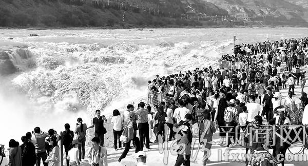临汾新闻网讯 国庆长假期间,水流浩荡、气势磅礴的黄河壶口瀑布吸引了众多游客在此亲身感受“天下黄河一壶收”的壮美景色。(吕桂明)