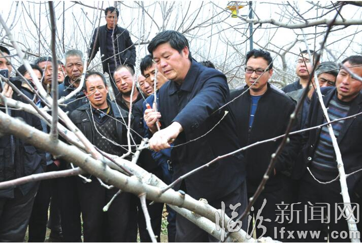 图为3月19日,果树专家闫广民在吉昌镇兰村就春剪注意事项进行现场教学。