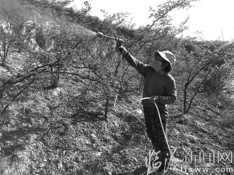 临汾新闻网讯 4月18日,吉县柏山寺乡圪塔村村民刘贤惠在为自己的花椒树喷施页面肥。自遭受大面积冻害后,吉县果农和椒农积极生产自救,采用科学的管理方法,最大限度减少农民损失。(张保华 杜 昱)
