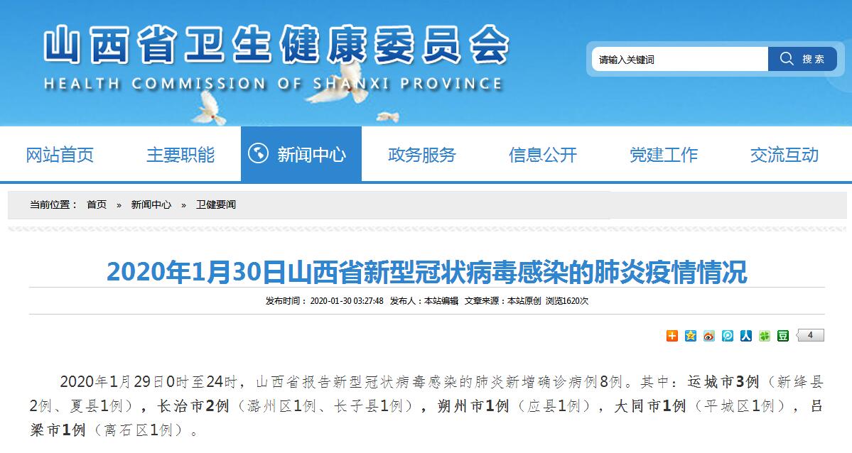 2020年1月29日0时至24时,山西省报告新型冠状病毒感染的肺炎新增确诊病例8例。其中:运城市3例(新绛县2例、夏县1例),长治市2例(潞州区1例、长子县1例),朔州市1例(应县1例),大同市1例(平城区1例),吕梁市1例(离石区1例)。