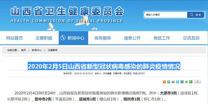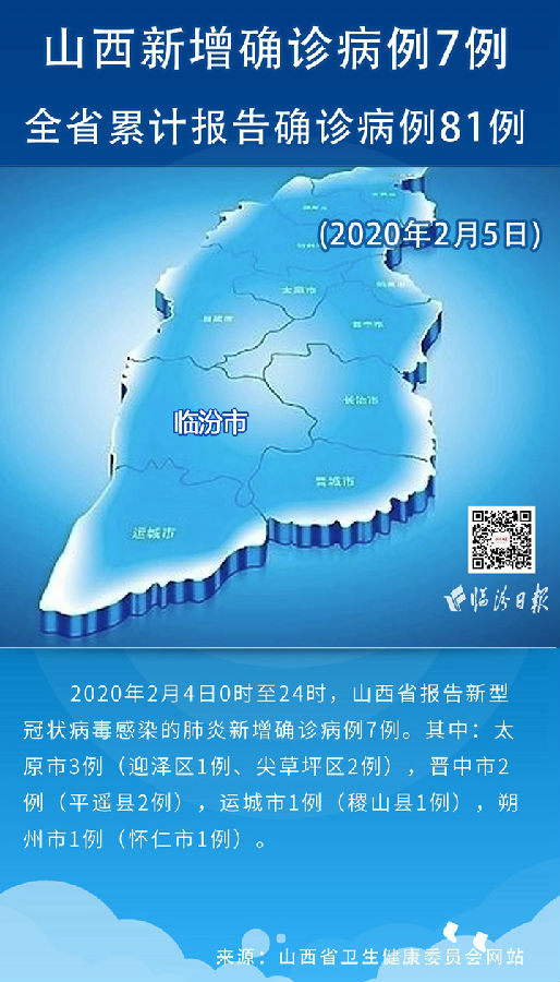 2020年2月4日0时至24时,山西省报告新型冠状病毒感染的肺炎新增确诊病例7例。其中:太原市3例(迎泽区1例、尖草坪区2例),晋中市2例(平遥县2例),运城市1例(稷山县1例),朔州市1例(怀仁市1例)。