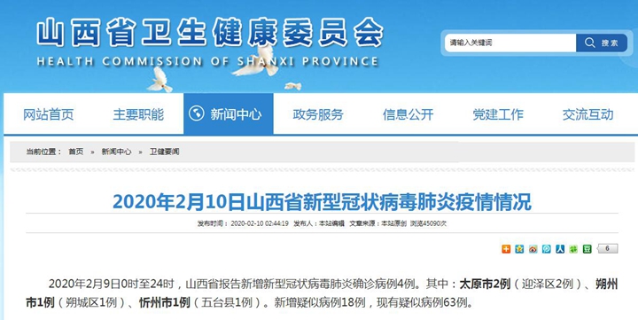 2020年2月9日0时至24时,山西省报告新增新型冠状病毒肺炎确诊病例4例。其中:太原市2例(迎泽区2例)、朔州市1例(朔城区1例)、忻州市1例(五台县1例)。新增疑似病例18例,现有疑似病例63例。