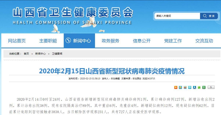 2020年2月14日0时至24时,山西省报告新增新型冠状病毒肺炎确诊病例1例,累计确诊病例127例。新增治愈出院2例,累计治愈出院38例。现有在院隔离治疗89例,其中重症6例,危重症4例。新增疑似病例12例,现有疑似病例62例。目前累计追踪到密切接触者3838人,当日解除医学观察231人,共有727人正在接受医学观察。