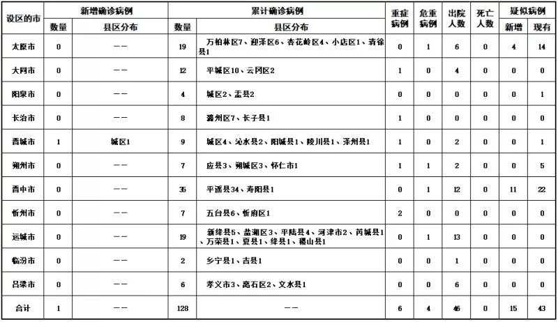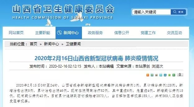 2020年2月15日0时至24时,山西省报告新增新型冠状病毒肺炎确诊病例1例,累计确诊病例128例。新增治愈出院8例,累计治愈出院46例。现有在院隔离治疗82例,其中重症6例,危重症4例。新增疑似病例15例,现有疑似病例43例。目前累计追踪到密切接触者3870人,当日解除医学观察189人,共有569人正在接受医学观察。