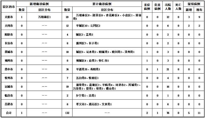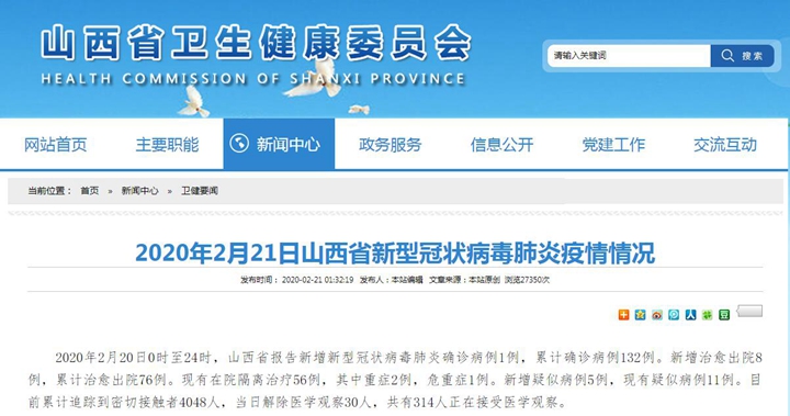 2020年2月20日0时至24时,山西省报告新增新型冠状病毒肺炎确诊病例1例,累计确诊病例132例。新增治愈出院8例,累计治愈出院76例。现有在院隔离治疗56例,其中重症2例,危重症1例。新增疑似病例5例,现有疑似病例11例。目前累计追踪到密切接触者4048人,当日解除医学观察30人,共有314人正在接受医学观察。