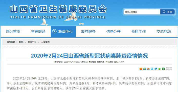 2020年2月23日0时至24时,山西省无报告新增新型冠状病毒肺炎确诊病例,累计确诊病例132例。新增治愈出院7例,累计治愈出院88例。现有在院隔离治疗44例,其中危重症1例。新增疑似病例4例,现有疑似病例12例。目前累计追踪到密切接触者4114人,当日解除医学观察31人,共有274人正在接受医学观察。