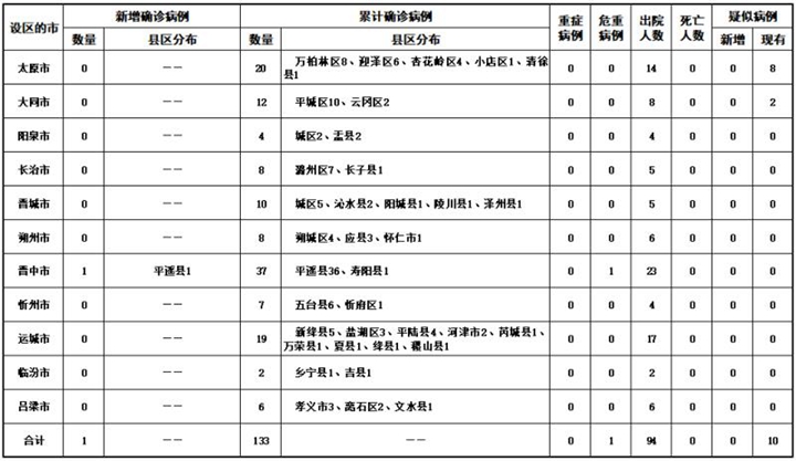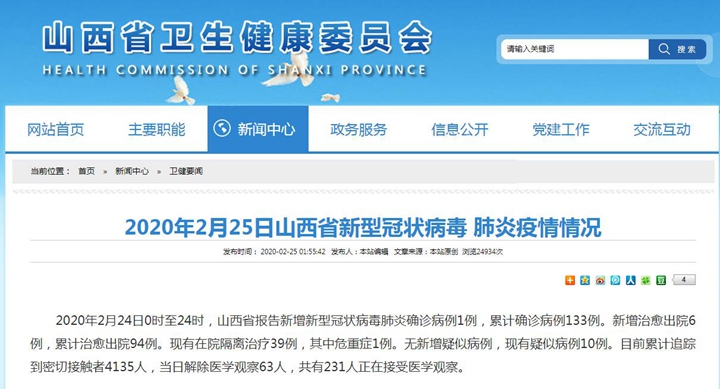 2020年2月24日0时至24时,山西省报告新增新型冠状病毒肺炎确诊病例1例,累计确诊病例133例。新增治愈出院6例,累计治愈出院94例。现有在院隔离治疗39例,其中危重症1例。无新增疑似病例,现有疑似病例10例。目前累计追踪到密切接触者4135人,当日解除医学观察63人,共有231人正在接受医学观察。