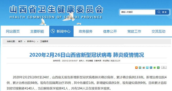 2020年2月25日0时至24时,山西省无报告新增新型冠状病毒肺炎确诊病例,累计确诊病例133例。新增治愈出院4例,累计治愈出院98例。现有在院隔离治疗35例,其中危重症1例。新增疑似病例1例,现有疑似病例9例。目前累计追踪到密切接触者4140人,当日解除医学观察41人,共有194人正在接受医学观察。