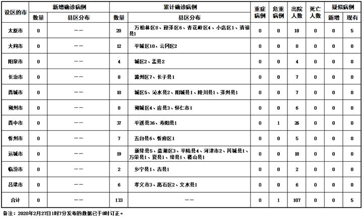 上一篇: 2020年2月27日山西省新型冠状病毒 肺炎疫情情况