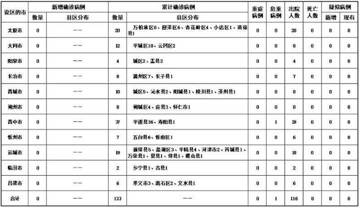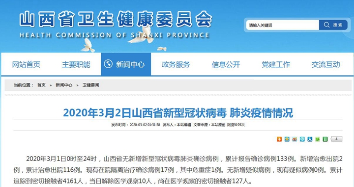 2020年3月1日0时至24时,山西省无新增新型冠状病毒肺炎确诊病例,累计报告确诊病例133例。新增治愈出院2例,累计治愈出院116例。现有在院隔离治疗确诊病例17例,其中危重症1例。无新增疑似病例,现有疑似病例0例。累计追踪到密切接触者4161人,当日解除医学观察10人,尚在医学观察的密切接触者127人。