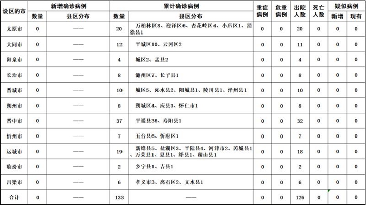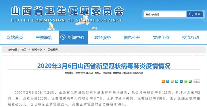 2020年3月5日0时至24时,山西省无新增新型冠状病毒肺炎确诊病例,累计报告确诊病例133例。新增治愈出院2例,累计治愈出院126例。现有在院隔离治疗确诊病例7例。无新增疑似病例,现有疑似病例0例。累计追踪到密切接触者4166人,当日解除医学观察22人,尚在医学观察的密切接触者58人。