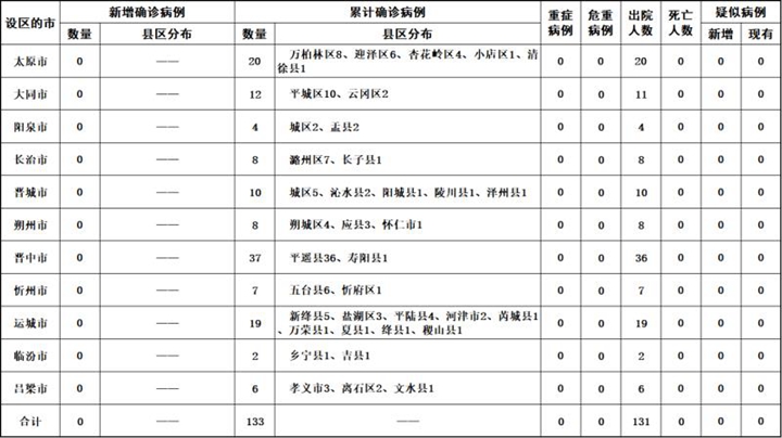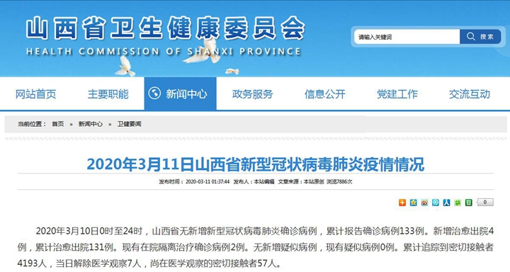 2020年3月10日0时至24时,山西省无新增新型冠状病毒肺炎确诊病例,累计报告确诊病例133例。新增治愈出院4例,累计治愈出院131例。现有在院隔离治疗确诊病例2例。无新增疑似病例,现有疑似病例0例。累计追踪到密切接触者4193人,当日解除医学观察7人,尚在医学观察的密切接触者57人。