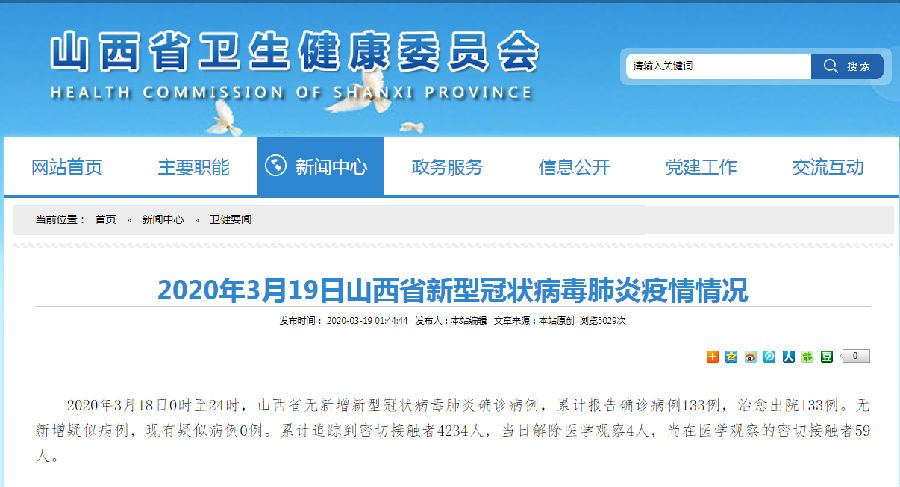 2020年3月18日0时至24时,山西省无新增新型冠状病毒肺炎确诊病例,累计报告确诊病例133例,治愈出院133例。无新增疑似病例,现有疑似病例0例。累计追踪到密切接触者4234人,当日解除医学观察4人,尚在医学观察的密切接触者59人。