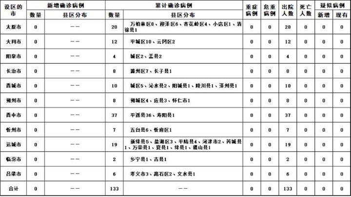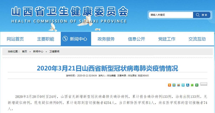 2020年3月20日0时至24时,山西省无新增新型冠状病毒肺炎确诊病例,累计报告确诊病例133例,治愈出院133例。无新增疑似病例,现有疑似病例0例。累计追踪到密切接触者4254人,当日解除医学观察1人,尚在医学观察的密切接触者74人。