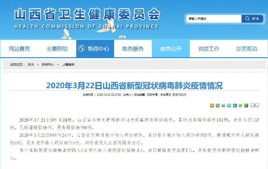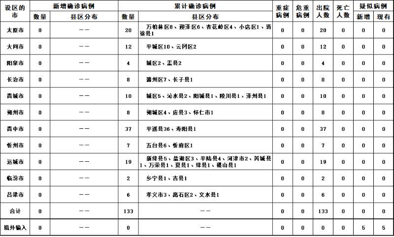 2020年3月21日0时至24时,山西省本地无新增新型冠状病毒肺炎确诊病例,累计报告确诊病例133例,治愈出院133例。无新增疑似病例,现有疑似病例0例。