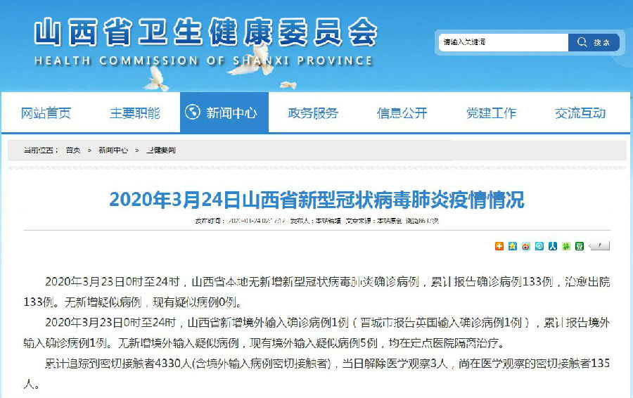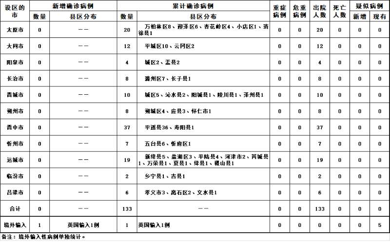 2020年3月23日0时至24时,山西省本地无新增新型冠状病毒肺炎确诊病例,累计报告确诊病例133例,治愈出院133例。无新增疑似病例,现有疑似病例0例。