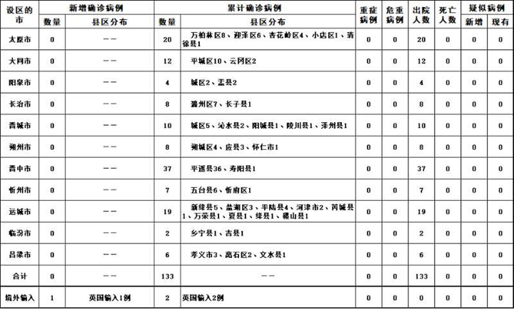 2020年3月25日0时至24时,山西省本地无新增新型冠状病毒肺炎确诊病例,累计报告确诊病例133例,治愈出院133例。无新增疑似病例,现有疑似病例0例。