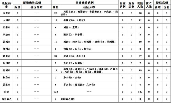 2020年3月29日0时至24时,山西省本地无新增新型冠状病毒肺炎确诊病例,累计报告确诊病例133例,治愈出院133例。无新增疑似病例,现有疑似病例0例。