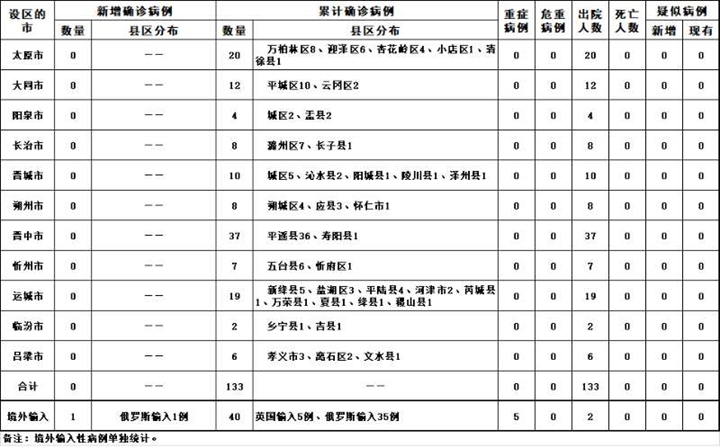 2020年4月12日0-24时,山西省本地无新增新冠肺炎确诊病例、疑似病例和无症状感染者。累计报告确诊病例133例,治愈出院133例。