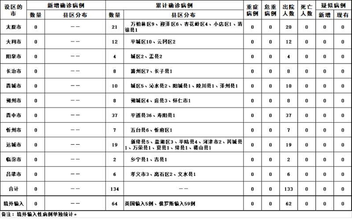2020年5月7日0-24时,山西省无本地新增新冠肺炎确诊病例。累计报告确诊病例134例,治愈出院133例,现有在院隔离治疗病例1例。现有疑似病例0例。