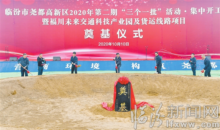 10月10日上午,全省开发区2020年第二期“三个一批”活动举行。我市分会场设在尧都高新技术产业开发区,与全省同步举行项目集中签约仪式,并举行项目开工奠基仪式和现场观摩。市委书记董一兵在全省会议上汇报了我市开发区第二期“三个一批”活动情况。市委副书记、市长李云峰主持临汾分会场签约仪式。市领导黄巍、陈纲、王渊、任天顺、张翔,市直有关部门主要负责人,各县(市、区)委书记、县(市、区)长,临汾经济开发区党工委书记、管委会主任,各开发区管委会常务副主任及签约企业、客商代表在我市分会场参加会议。图为市领导为福川未来交通科技产业园及货运线路项目培土奠基。 记者 苏亚兵 摄