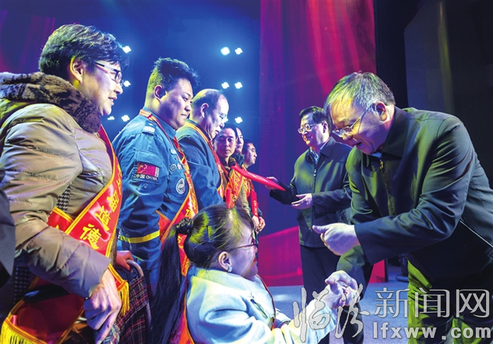 讲述动人故事,传递道德力量。12月19日晚,市影剧院内座无虚席,“德耀平阳”临汾市第五届“十大道德楷模”颁奖典礼在这里隆重举行。省人大常委会副主任、市委书记岳普煜,市委副书记、市长刘予强分别为“十大道德楷模”获得者颁发奖牌和证书。市领导陈小洪、张建平、周计伟、李朝旗、郭行杰、刘文华、张庚博、王国平、冯建宁、潘海燕、闫建国、张翔、杨忠华、梁清燕,山西师范大学临汾学院党委书记毛跟云出席颁奖典礼。图为岳普煜、刘予强为“十大道德楷模”获得者颁奖。记者 闫锐鹏 摄