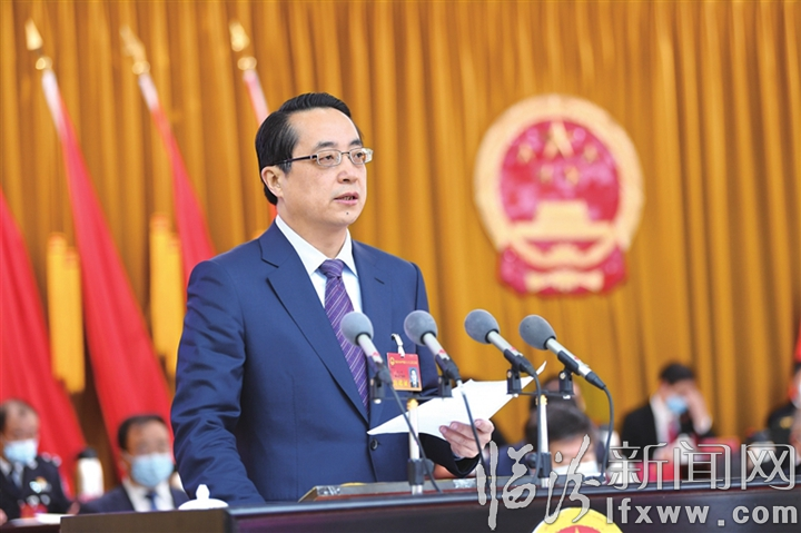 4月18日,李云峰作政府工作报告。记者 赵俊堂 摄