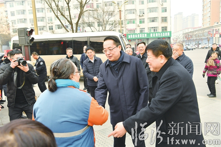 又是一年新春到,最是情暖岁寒时。1月22日,市委书记董一兵带领市四套班子领导,看望慰问了驻临部队和春节期间仍然坚守一线的干部职工,向大家致以诚挚问候和新春祝福。市领导陈小洪、郭行杰、郝忠祥、潘海燕、张勇一同慰问。军分区司令员王彬、政委刘海洋参加军分区慰问。图为市委副书记、代市长李云峰慰问坚守一线的环卫工作者。记者 苏亚兵 摄