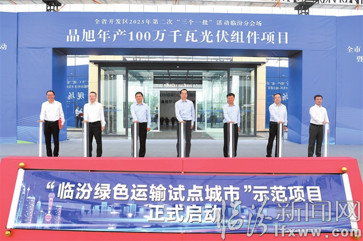 5月29日,我市与全省同步举行开发区2023年第二次“三个一批”活动。活动以视频连线方式举行,我市分会场设在临汾经济开发区甘亭新型工业园临宜环保科技产业园2号厂房。市委书记李云峰出席。市委副书记、市长王延峰主持临汾分会场签约仪式。全省优化营商环境和开发区重点工作督导第六组组长李志松及督导组其他成员,市领导郝忠祥、闫建国、崔元斌、王彬、李强、郭行杰、王国平、张希亮、胡晓刚、乔飞鸿出席。图为李云峰、王延峰、李志松等领导共同为项目开工按下启动键。 记者 魏 华 摄
