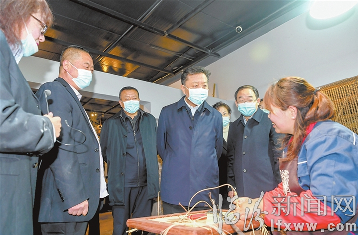 临汾新闻网讯 12月5日,市委书记闫晨曦赴襄汾县调研文物保护利用工作。他强调,要深入学习贯彻党的十九届六中全会和习近平总书记在深入推动黄河流域生态保护和高质量发展座谈会上重要讲话精神,以对历史负责、对人民负责、对未来负责的态度,加大文物保护力度,创新文化传承利用,深化文旅融合发展,使文物保护利用成果更多惠及人民群众。市委常委、秘书长郭行杰,市委常委、宣传部长闫建国参加。图为闫晨曦在山西唐人居古典家居文化有限公司调研。记者 闫锐鹏 摄