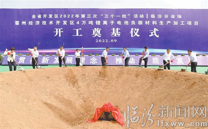 9月5日,全省开发区2022年第三次“三个一批”活动暨太忻一体化经济区建设推进会召开,我市以视频连线方式与全省同步举行开发区2022年第三次“三个一批”活动。我市分会场设在霍州经济技术开发区高端装备制造产业园智创园1号厂房。市委书记闫晨曦出席。市委副书记、市长李云峰主持我市分会场签约仪式。全省优化营商环境和开发区重点工作督导第六组组长唐晋及督导组其他成员,市领导黄巍、郭行杰、郝献民、胡晓刚出席。市委办公室、市政府办公室和市直有关部门主要负责同志,各县(市、区)委书记、县(市、区)长,各开发区管委会负责同志,相关签约企业、客商代表等参加。图为霍州经济技术开发区4万吨锂离子电池负极材料生产加工项目开工奠基仪式现场。记者 魏华 摄