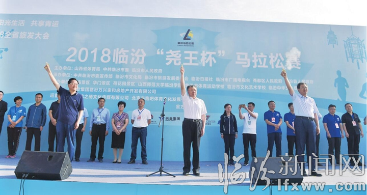 五月的临汾,生机无限,热情似火。5月27日上午8时,2018临汾“尧王杯”马拉松赛在华门广场激情开跑。省人大常委会副主任、市委书记岳普煜,省体育局局长赵晓春,市委副书记、市长刘予强共同为比赛鸣枪。省体育局副局长杜荣,市领导陈纲、王金珍、闫建国、刘小才等出席起跑仪式。及5公里迷你马拉松3个竞赛大项。图为岳普煜、赵晓春、刘予强比赛鸣枪。记者 闫锐鹏 苏亚兵 郑远飞 摄