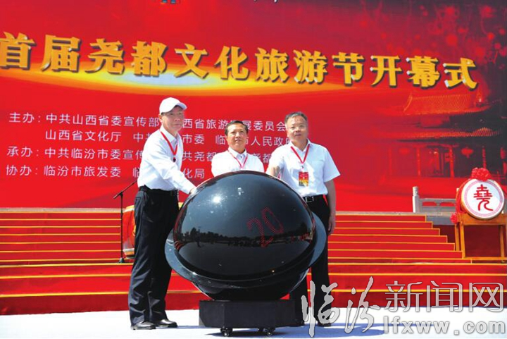 省委常委、宣传部部长廉毅敏宣布开幕。省人大常委会副主任、市委书记岳普煜致辞。副省长张复明,全国新闻工作者协会党组书记、常务副主席翟惠生,全国政协委员、中科院研究员宋镇豪,全国政协原副秘书长何丕洁,三晋文化研究会名誉会长、省人大常委会原副主任李玉明,山西中华文化促进会主席、省政协原副主席姜新文,青岛市人大常委会原主任王文华,省委副秘书长毛益民,省政府副秘书长丁纪岗,省委宣传部副部长郭健,省旅发委主任盛佃清,省文化厅厅长刘润民,省台办主任吴伟,山西师范大学党委书记符惠明等领导和嘉宾,市四套班子有关领导出席开幕式。市委副书记、市长刘予强主持。图为廉毅敏、岳普煜、张复明共同按下开幕式启动球。记者 苏亚兵 摄