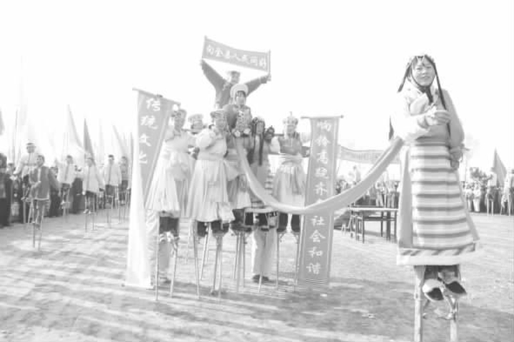 每年正月,他总是踩着高跷四处走动,特别是跷腿上绑着的黄铜铃,走起来声音十分悦耳。