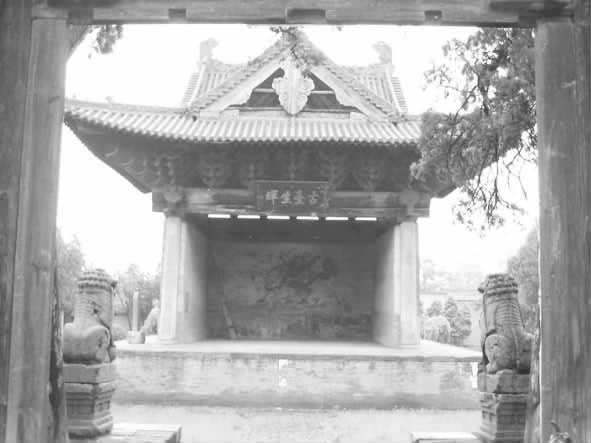 尧陵祠大门下涝河萦带,门上为古戏台向北坐南。