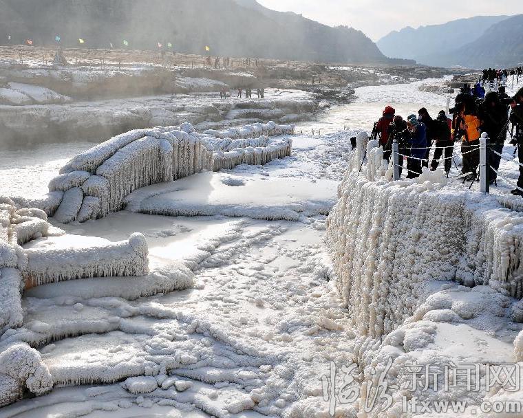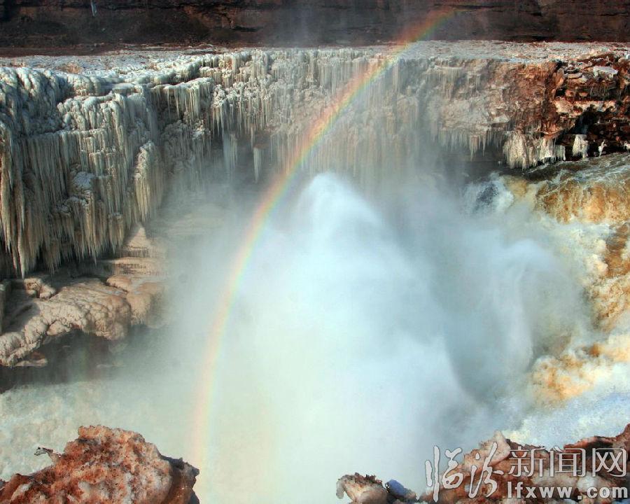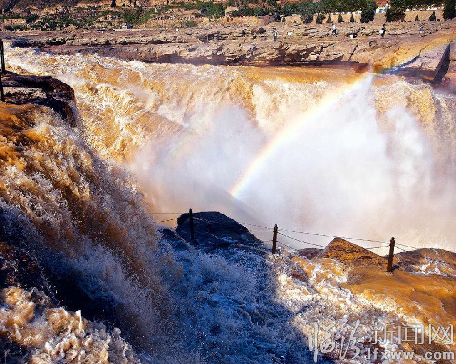 壶口瀑布处于秦晋峡谷的南段,南距龙门约65公里,孟门5公里。壶口一带,黄河西岸下陡上缓,狭谷谷底宽约400米,由谷底上坡到龙王坡坡高约150米,崖岸很陡,龙王坡以上谷形展宽,谷坡平缓,黄河的横剖面成谷中谷的形态,在龙王辿以北,河幅宽度和狭谷宽度一致,河水充满狭谷,常水位流量在每秒1000~3000立方米,水面宽400余米,龙王辿以下,水流到壶口,在平整的谷底冲成一道深槽。小河槽宽30~50米,深约30米。壶口以上,水在宽槽中流行,到了深槽上端,400米宽的水面一下子全部倾注到30~50米宽的深槽中,形成瀑布。春季,为瀑布落凌期,河道里冰层断裂,“壶口”内冰凌坠落。夏季,由于壶口以上水流的变化,出现3条叉流,壶口附近形成3个主要瀑布:一个位于龙槽顶端,落差约10米;另外两个分别从龙槽西岸和东岸跌入龙槽,落差分别为15米和7米。这种观察常常在不断的变化着,有时大雨后,槽端满溢,还会形成多股瀑布。秋季,红叶夹岸,瀑布高悬30余米,水帘挂入云端,景色壮观。冬季,秦晋长峡冰封雪冻,不少河段成为天然冰桥,往日飞瀑高悬处,挂满冰凌。壶口瀑布是中国黄河上的著名瀑布,其奔腾汹涌的气势是中华民族精神的象征。