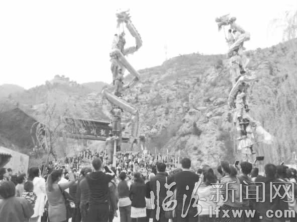 好戏轮番上演,舞龙”表演随即登场。演员们举竿奔走,两条色彩绚丽的“龙”立即显得活灵活现,时而欢腾奔跃,时而蜿蜒游走,时而幻变造型。在众人的惊叹声中,演员们顺杆而上,立为“人柱”,两条“龙”盘旋而上,一条喷出火焰,一条喷出水花,名为“双龙斗法”。这一高超的技艺,赢得阵阵掌声。