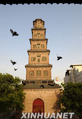 2008年4月22日,一群鸽子从铁佛寺前飞过。