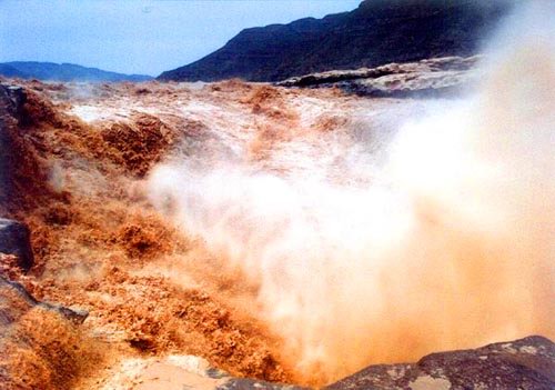 壶口瀑布,落差约30米,宽度最大时可达千余米,最大瀑面3万平方米。滚滚洪流,到这里急速收敛,注入深潭,声似雷鸣,数公里外可闻;水波急溅,激起百丈水柱,形成腾腾雾气,真有惊涛拍岸,浊浪排空,倒卷半天烟云之势!每每夏秋之季,彩虹贯于晴空,分外秀丽。其声、其势、其景,壮、秀、奇,使人不能不为之陶醉。