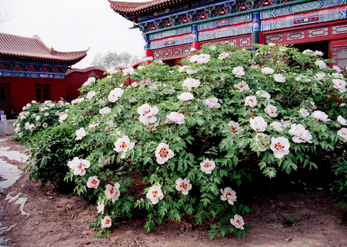 神牡丹四周的红芍药,是传说中四位侍女的化身。这四株芍药也非常神奇,她们的位置每年都会按顺时针方向移动,平均每年移动距离18厘米。芍药花期比牡丹稍迟一些,一般在五月底开放。