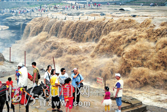 受黄河上游地区降雨和万家寨水库调节放水影响,当日,壶口瀑布迎来入汛以来第一次涨水,每秒流量超过2000立方,主副瀑布连成一片,形成一个特大的拐杖形瀑布群。浊流滚滚奔腾而下,气势极为壮观。吕桂明 摄