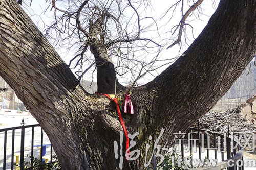 如今,树上还留有当年伐树的痕迹,只是一侧又长出了一枝直径达30厘米的成材树枝。树枝根部的“洞”在诉说着伐树时的情景。另一侧有一树洞,长着几枝嫩树枝,当地的村民在树枝上系上了红布,赋予了它灵气,祈求事事平安,风调雨顺。(文/图记者 王隰斌)