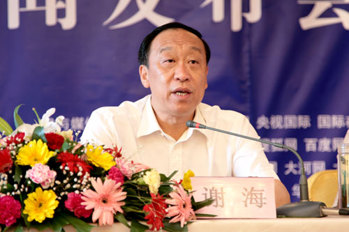 临汾市委书记谢海向全国网媒记者介绍临汾情况。