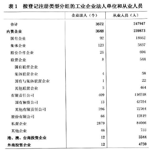 在工业企业法人单位中,国有企业及国有独资公司105个,占2.9%;集体企业123个,占3.4%;私营企业2879个,占78.4%;港、澳、台商投资企业12个,占0.3%;外商投资企业12个,占0.3%;其余类型企业541个,占14.7%。