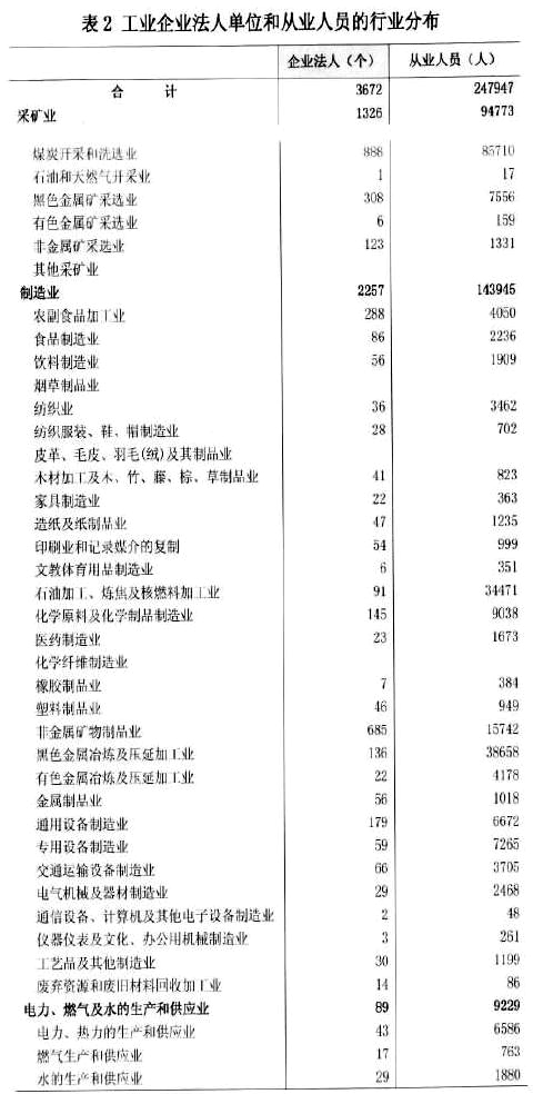 在工业企业法人单位的从业人员中,采矿业占38.2%,制造业占58.1%,电力、燃气及水的生产和供应业占3.7%。在工业行业大类中,煤炭开采和洗选业、黑色金属冶炼及压延加工业、石油加工炼焦及核燃料加工业从业人员数位居前三位,分别占34.6%、15.6%和13.9%(详见表2)。