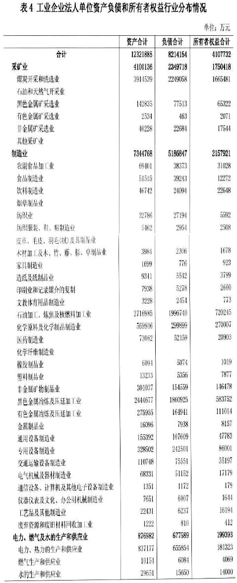 2008年末,工业企业法人单位资产负债率66.7%,采矿业为57.3%,其中,煤炭开采和洗选业57.5%;制造业为70.6%,其中,石油加工、炼焦及核燃料加工业73.5%、化学原料及化学制品制造业52.6%、黑色金属冶炼及压延加工业76.1%、有色金属冶炼及压延加工业59.8%;电力、燃气及水的生产和供应业为77.3%。其中,电力、热力的生产和供应业78.3%。