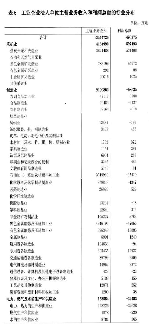 2008年,工业企业法人单位利润总额49.6亿元,比2004年减少11%。其中,采矿业占120.4%,制造业占-13.8%,电力、燃气及水的生产和供应业占-6.6%。利润总额超过1亿元的行业有3个,比2004年减少1个,其中:煤炭开采和洗选业53.1亿元、黑色金属矿采选业6.5亿元、专用设备制造业1.5亿元(详见表5)。