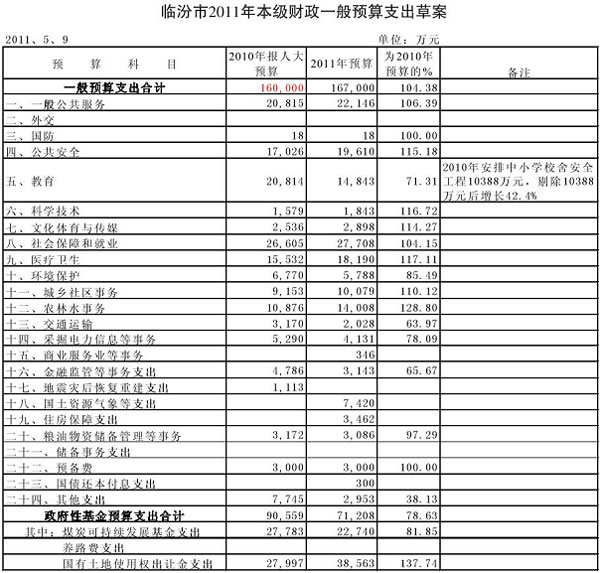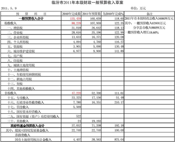 初步匡算,2011年全市总财力为120亿元。财力组成为:一般预算收入87亿元,返还性收入补助61625万元(增值税、消费税返还54363万元,所得税基数返还7262万元),财力性转移支付收入补助275647万元(一般性转移支付补助118878万元,工资转移支付补助103271万元,农村税费改革转移支付补助24508万元,缓解县乡困难转移支付补助2124万元,“两免一补”教育经费16722万元,中央、省属企业下划2777万元,各项结算补助7367万元)。全市一般预算支出安排120亿元。与总财力一致。